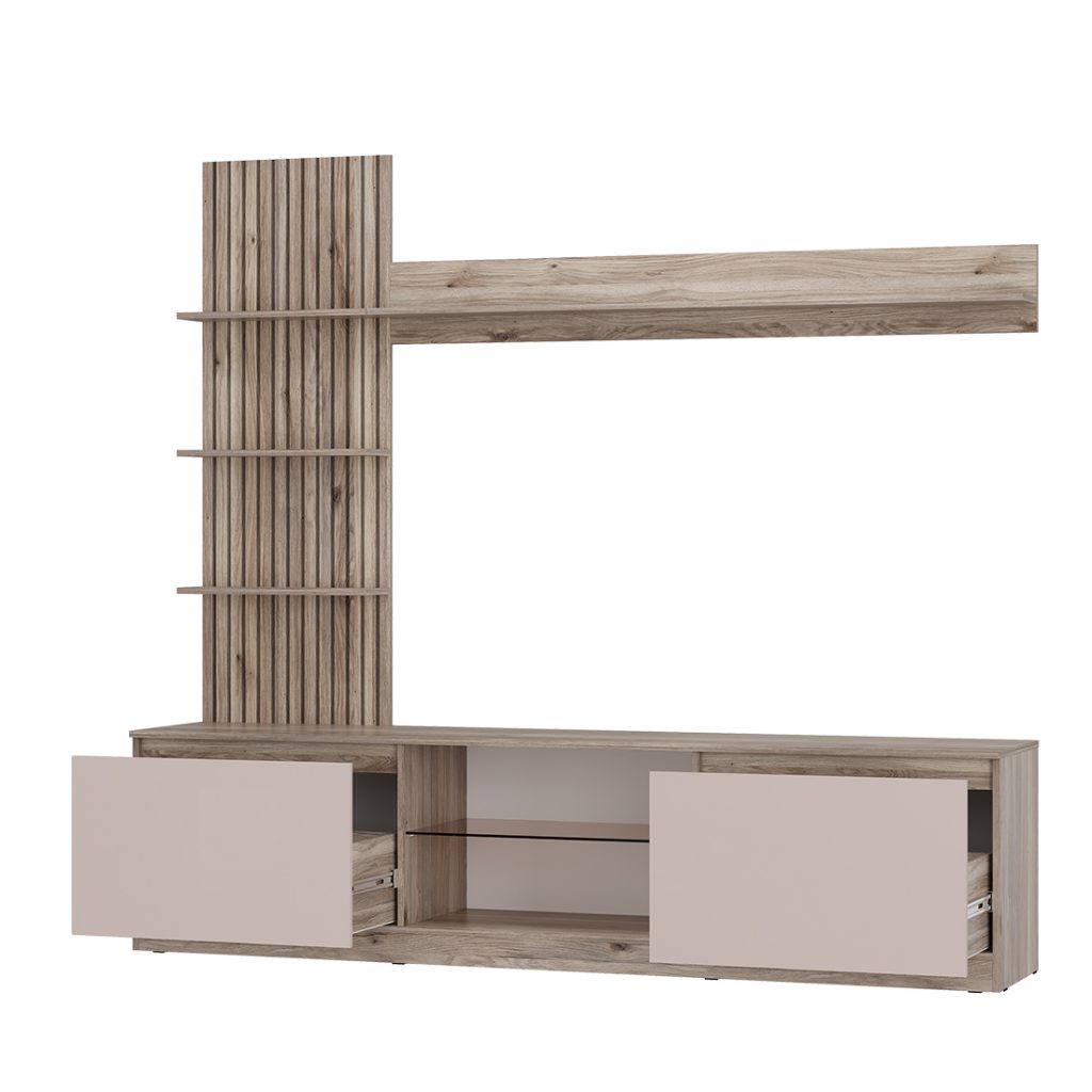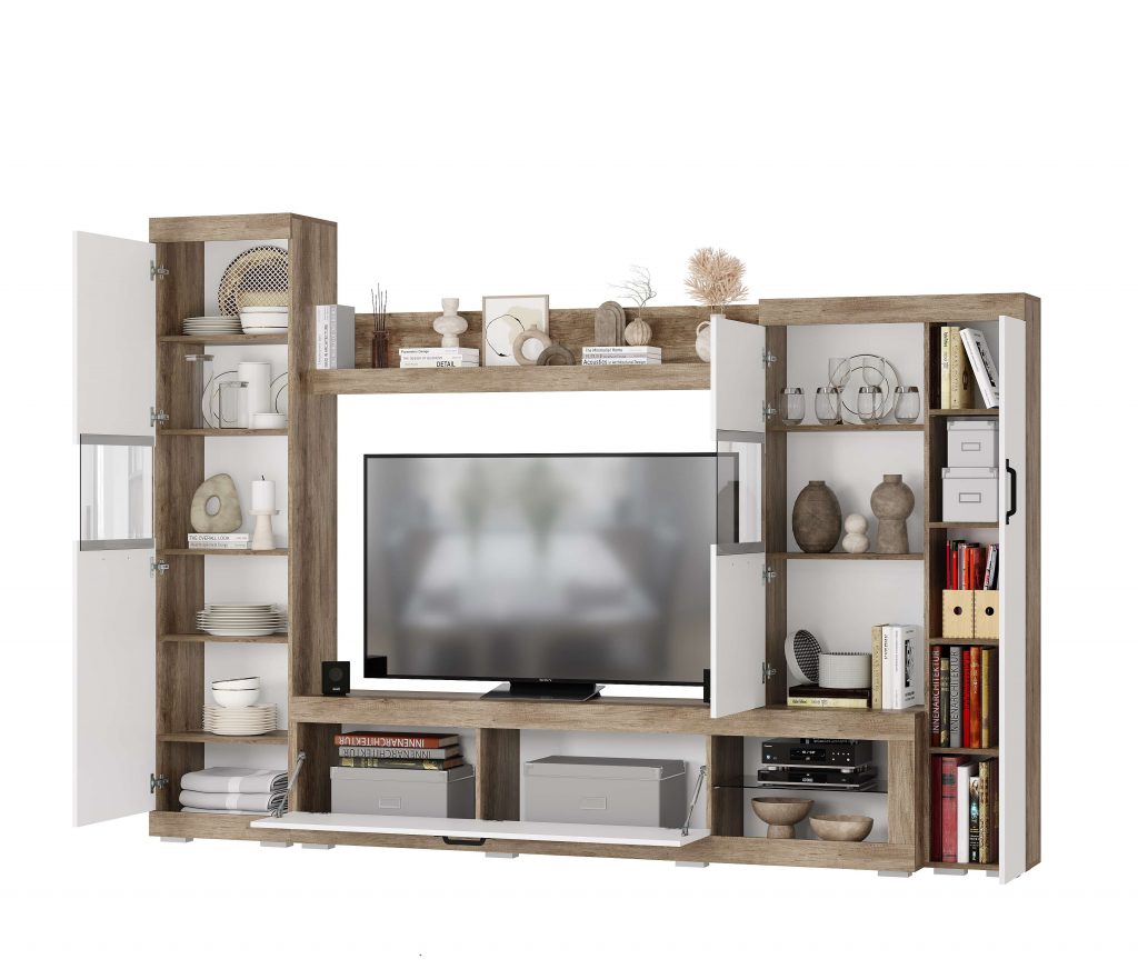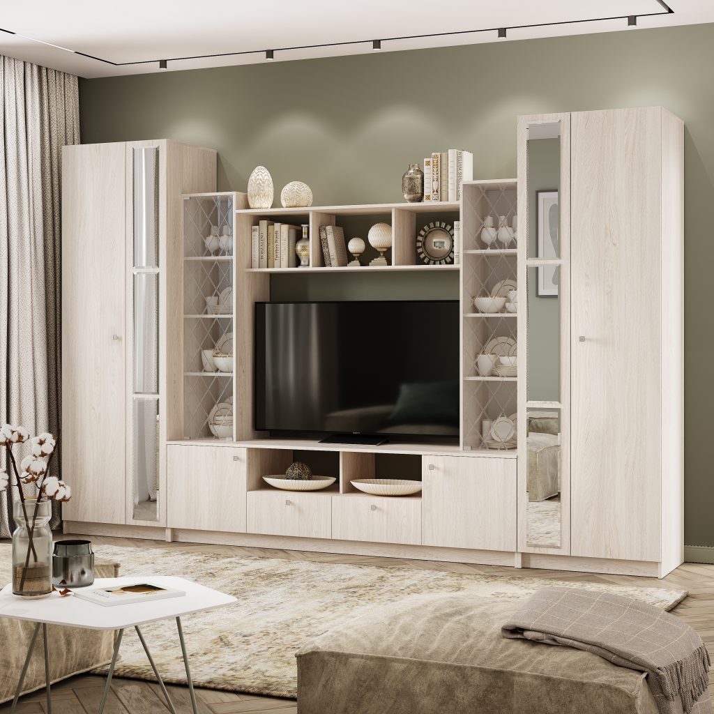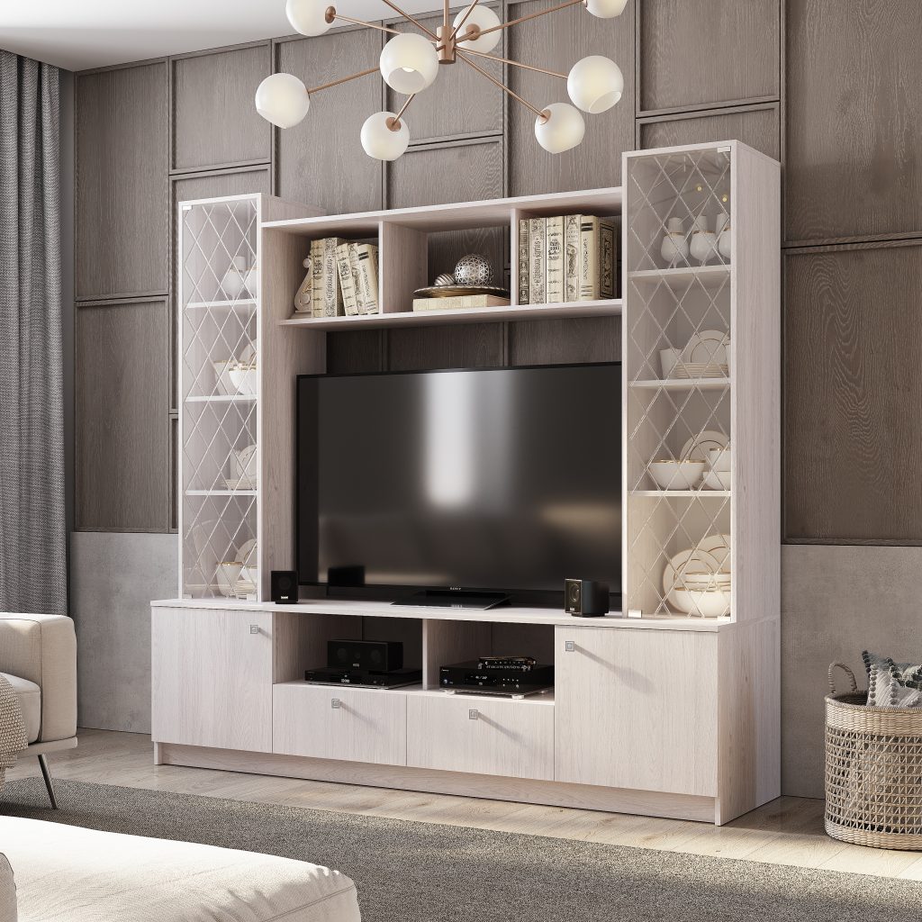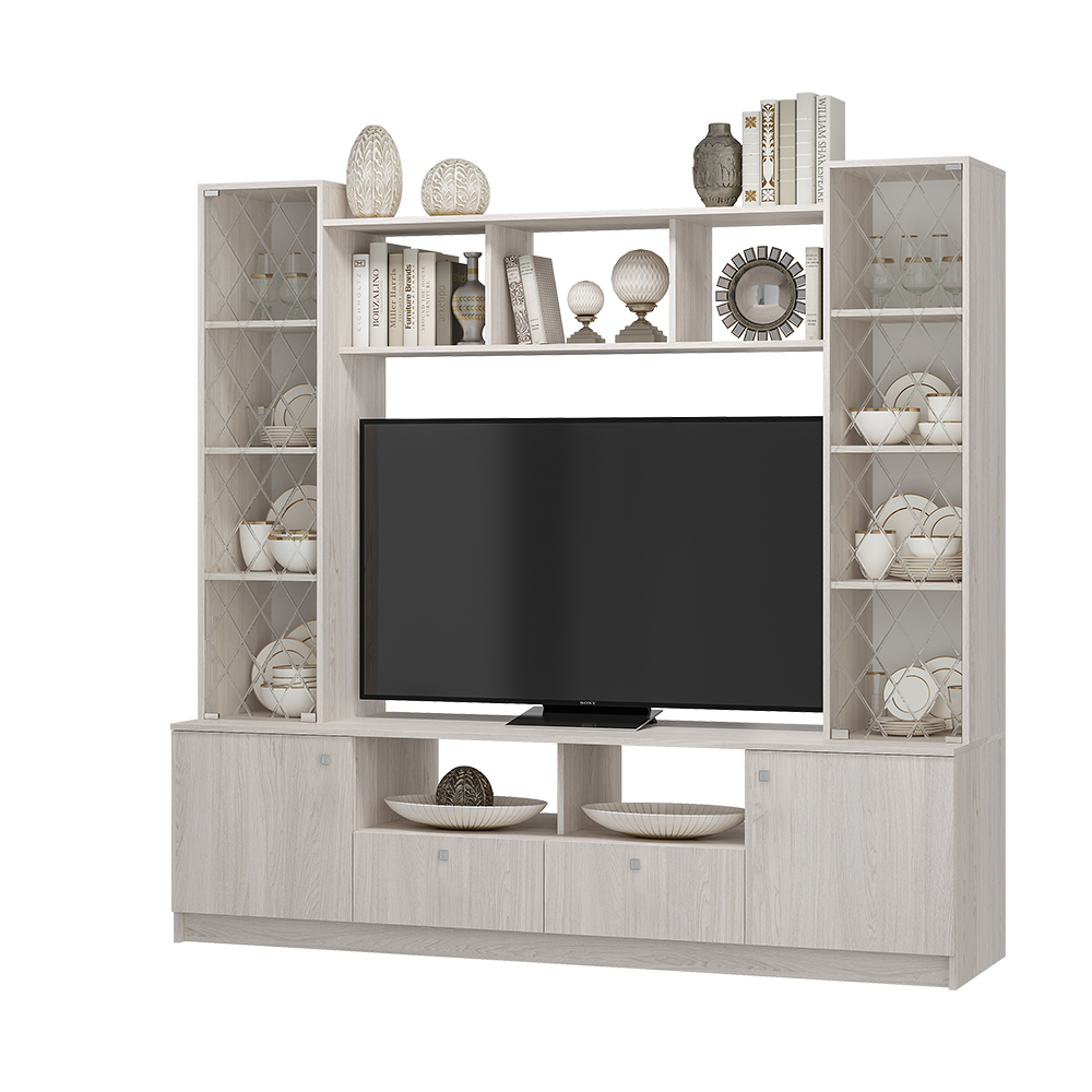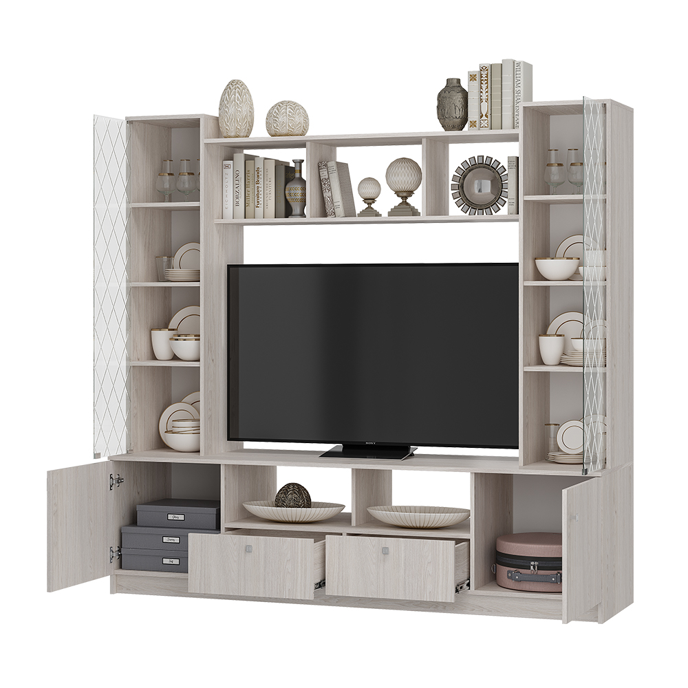 Гостиная Диамант фабрики БТС – идеальное решение для гостиной в современном стиле. Сдержанный дизайн позволит воплотить любую задумку в интерьере. Её конструкция совмещает в себе все современные тренды: скругленные фасады МДФ, отсутствие лицевой фурнитуры. Декоративная панель с открытыми полками дает возможность не только сделать телевизор стильным предметом интерьера, но и расставить на полках различные аксессуары. Наполнение: полки. Сборка: универсальная (на обе стороны). Фасады Белый глянец-МДФ Фасады Цемент светлый-ЛДСП