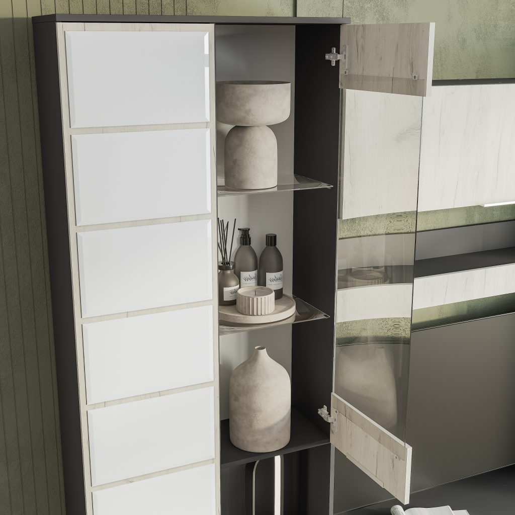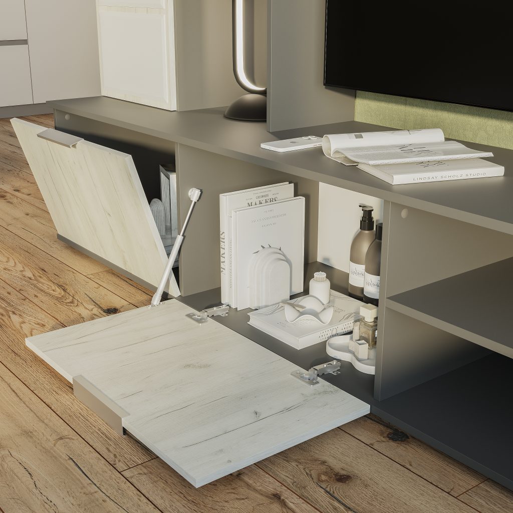 Центральная секция с нишей под телевизор. Закрытые полки с отделкой фасадов стеклом белый лакобель с фацетом. Стеклянный шкаф для посуды и декора. ​​​​Закрытые полки на газлифтах. ​​​​ Открытые полки для книг и аксессуаров. Толщина кромки - 0.45 мм. Опоры: прямоугольные черные 20 мм. Тип обработки стекла лакобель - фацет. Крепление стекла на фабрике. Ручка - накладная металл 128 мм. Петли - накладные/вкладные. Максимальная нагрузка на полку/штангу/вязку - 10 кг.