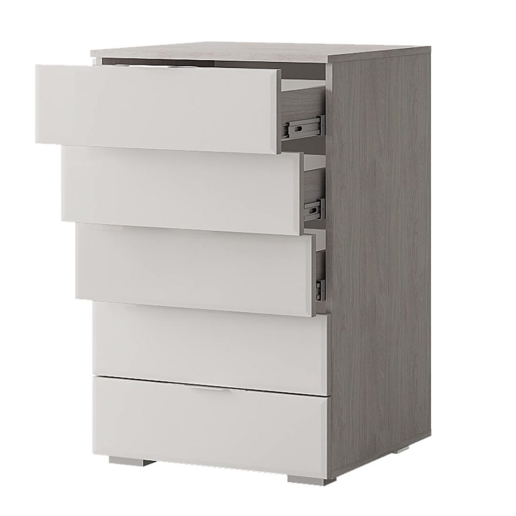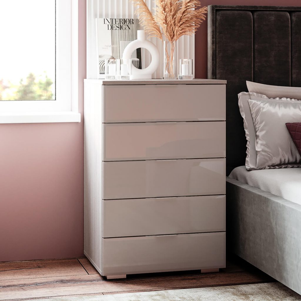 Комод «Алекса» - удобная система хранения для одежды, постельных принадлежностей или других хозяйственных аксессуаров, которая состоит из пяти вместительных выдвижных ящиков на шариковых направляющих, обеспечивающих лёгкую и бесшумную эксплуатацию модели. Кромка - 0,45 мм. Опоры - регулируемые, 20 мм. Ручки - металлические. Декор фасада - лакобель. Тип обработки - фацет. Максимальная нагрузка на ящик - 10 кг. Максимальная нагрузка на крышку комода - 7 кг.