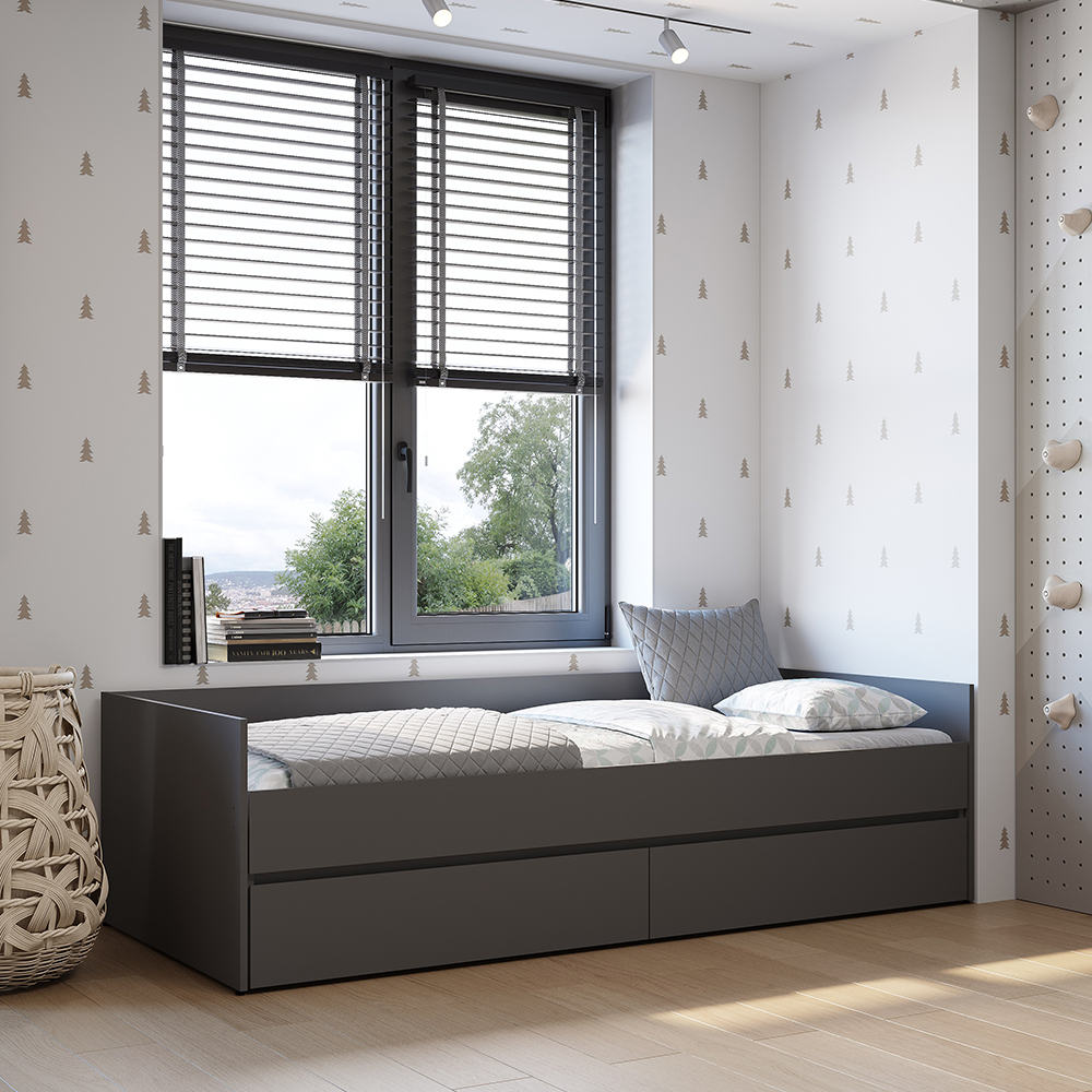 К данной модели кровати можно отдельно приобрести матрас-трансформер. «Симпл» - это современная коллекция функциональной мебели. В ней собраны все необходимые предметы для интерьера спальни, гостиной, детской комнаты, прихожей: шкафы, кровати, комоды, столы, тумбы. Коллекция полностью соответствует своему названию. Простой и стильный дизайн покорит ценителей минимализма. Отсутствует лицевая фурнитура. Мебель, выполненная в спокойных оттенках «белый» и «графит», идеально дополнит как классический, так и современный интерьер. Полноценный набор мебели позволяет экспериментировать с пространством.