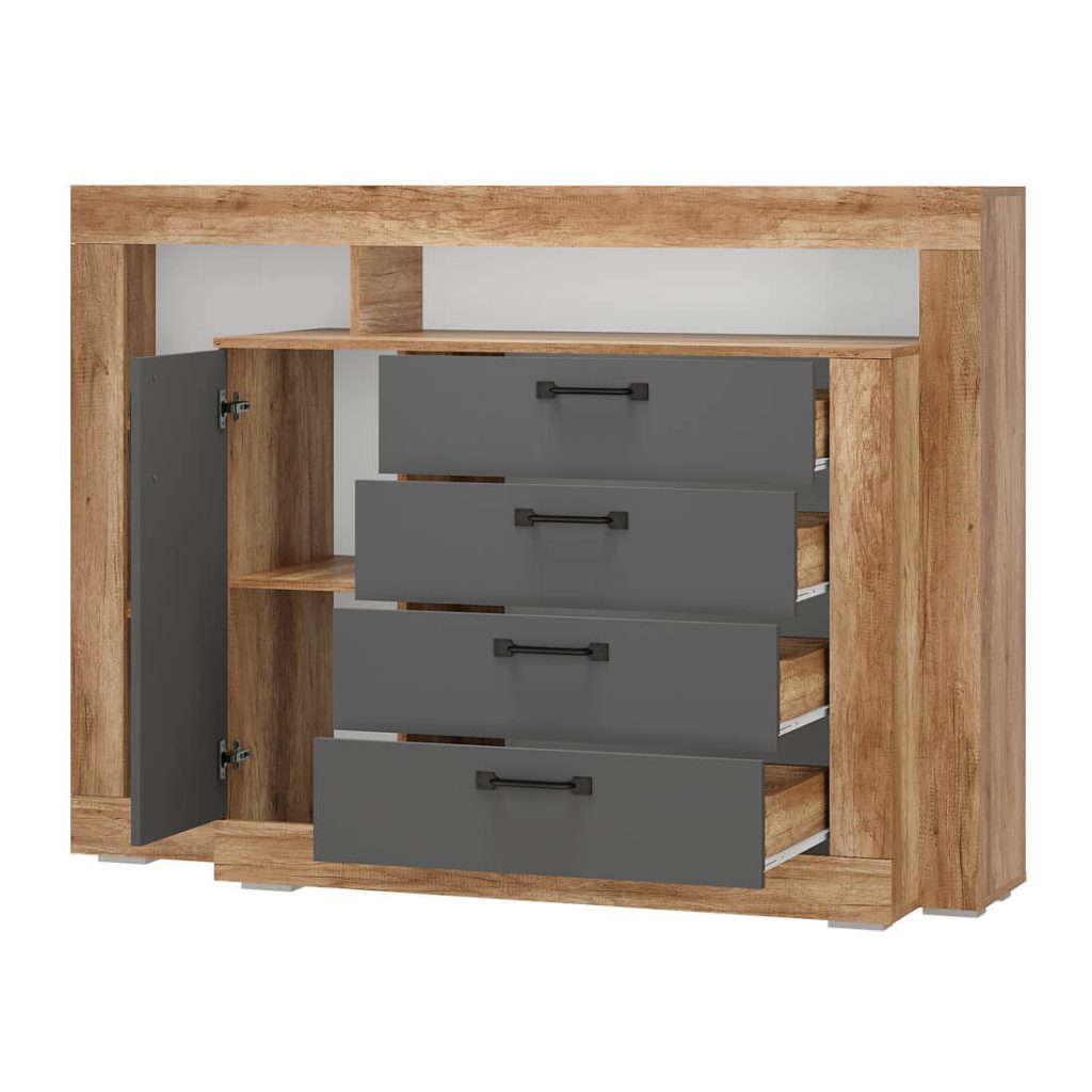 Гостиная Олива комплект- это элегантный и удобный комплект мебели для гостиной комнаты. Матовые фасады, украшенные оригинальной фрезеровкой. Комплект также оснащен стильными опорами, которые обеспечивают устойчивость.