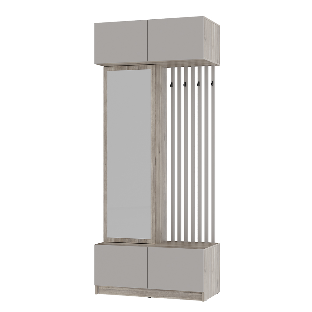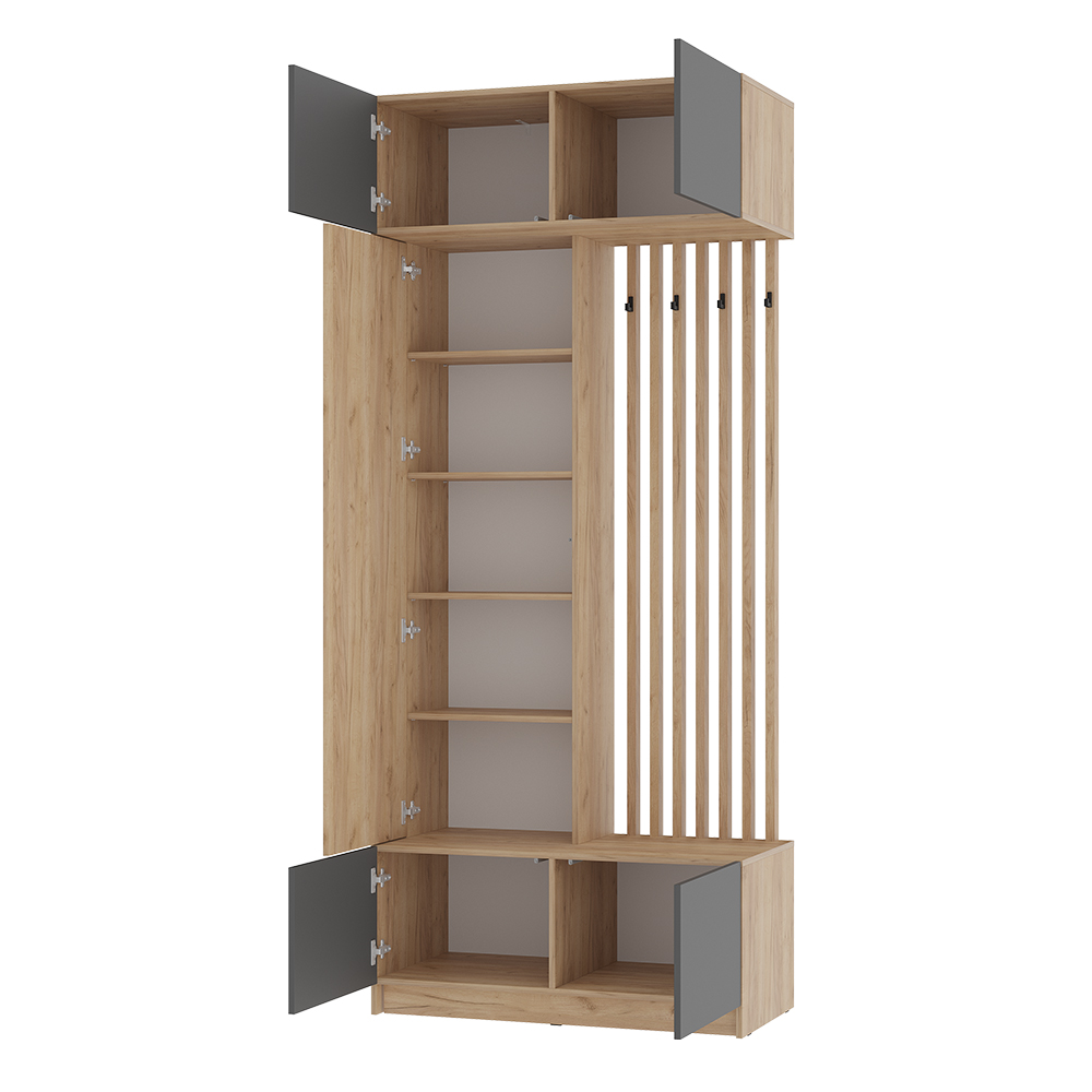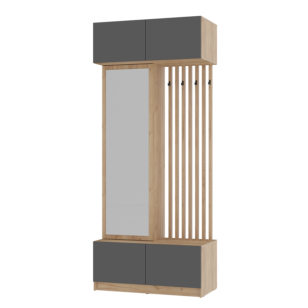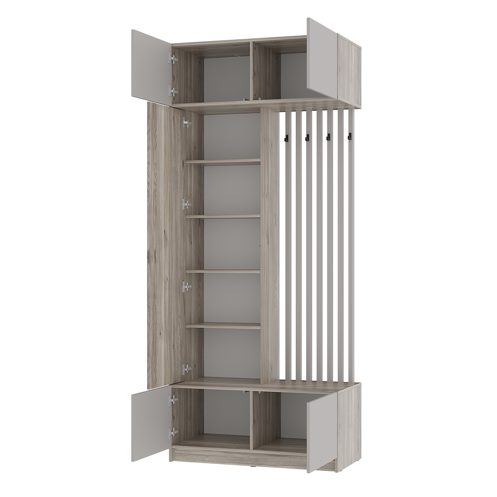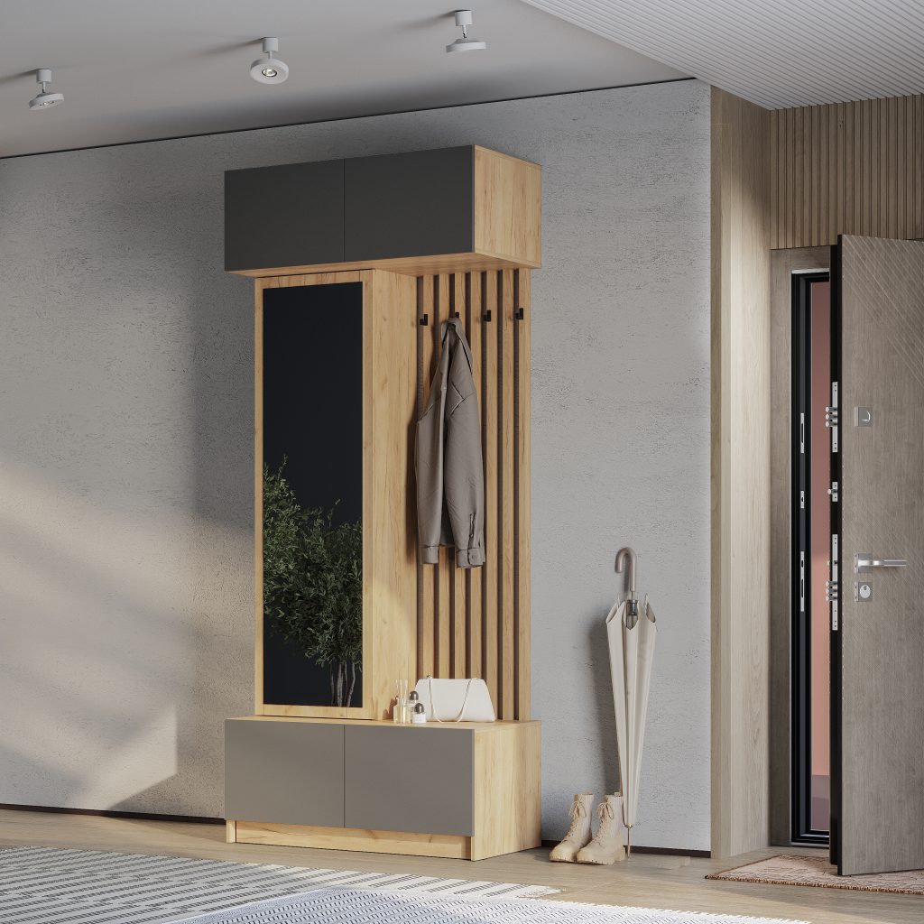 Стильная и компактная прихожая «Багира» – это оптимальное сочетание открытых и закрытых зон для хранения верхней одежды, головных уборов, обуви и аксессуаров. Толщина кромки – 0,45 мм. Задняя стенка – ЛДВП 4 мм. Опоры – подпятник. Крепление к стене – уголок овербаланс. Петли створок – накладная, 4-х шарнирная накладная. Механизм открывания push-to-open (ПР-03). Максимальная нагрузка на полку – 10 кг, на крючок – 5 кг.