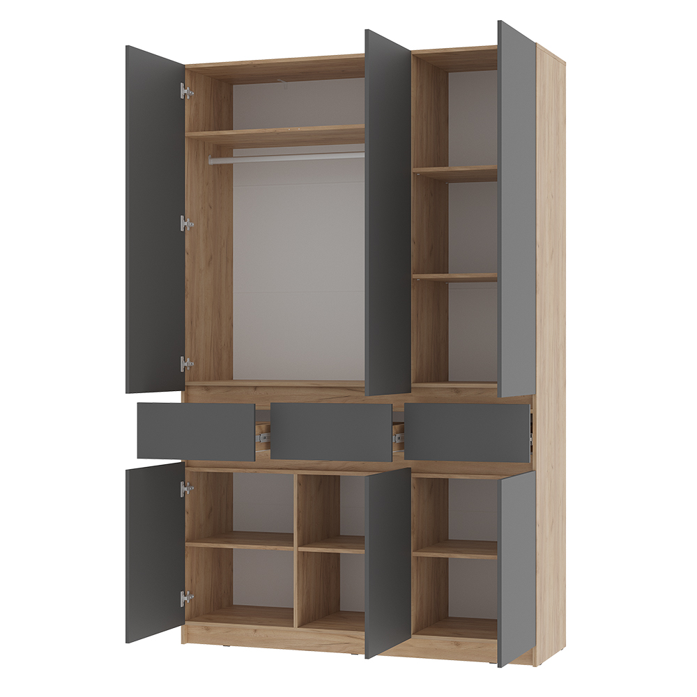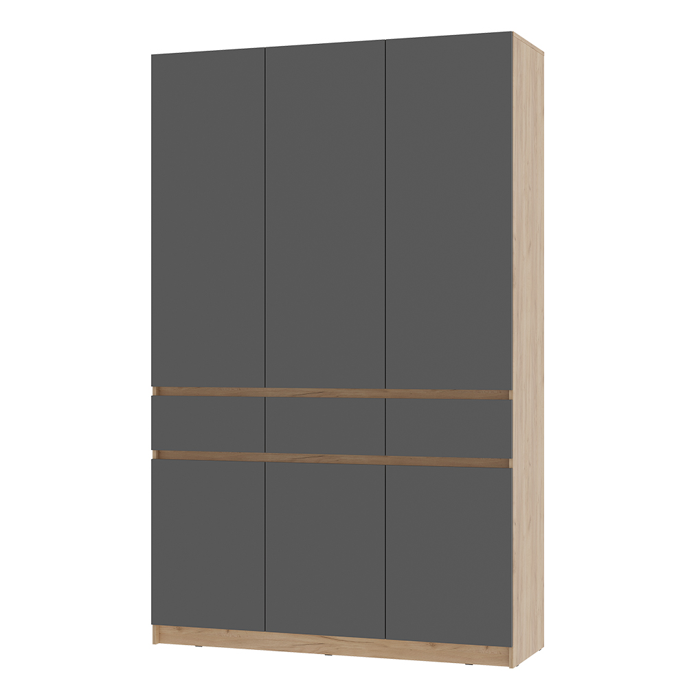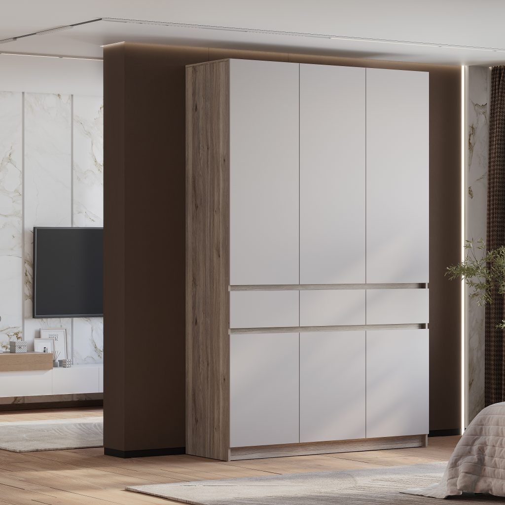 Шкаф 3-х створчатый "Багира" ШК-08 - это эстетичный дизайн и эргономичная конструкция. Хромированная штанга для аккуратного вертикального хранения одежды. Толщина кромки – 0,45 мм. Задняя стенка – ЛДВП 4 мм. Открывание за край створки. Опоры – подпятник. Крепление к стене – уголок овербаланс. Петли створок – накладные с доводчиком/без доводчика. Максимальная нагрузка на полку – 10 кг, на штангу – 5 кг, на ящик – 5 кг.